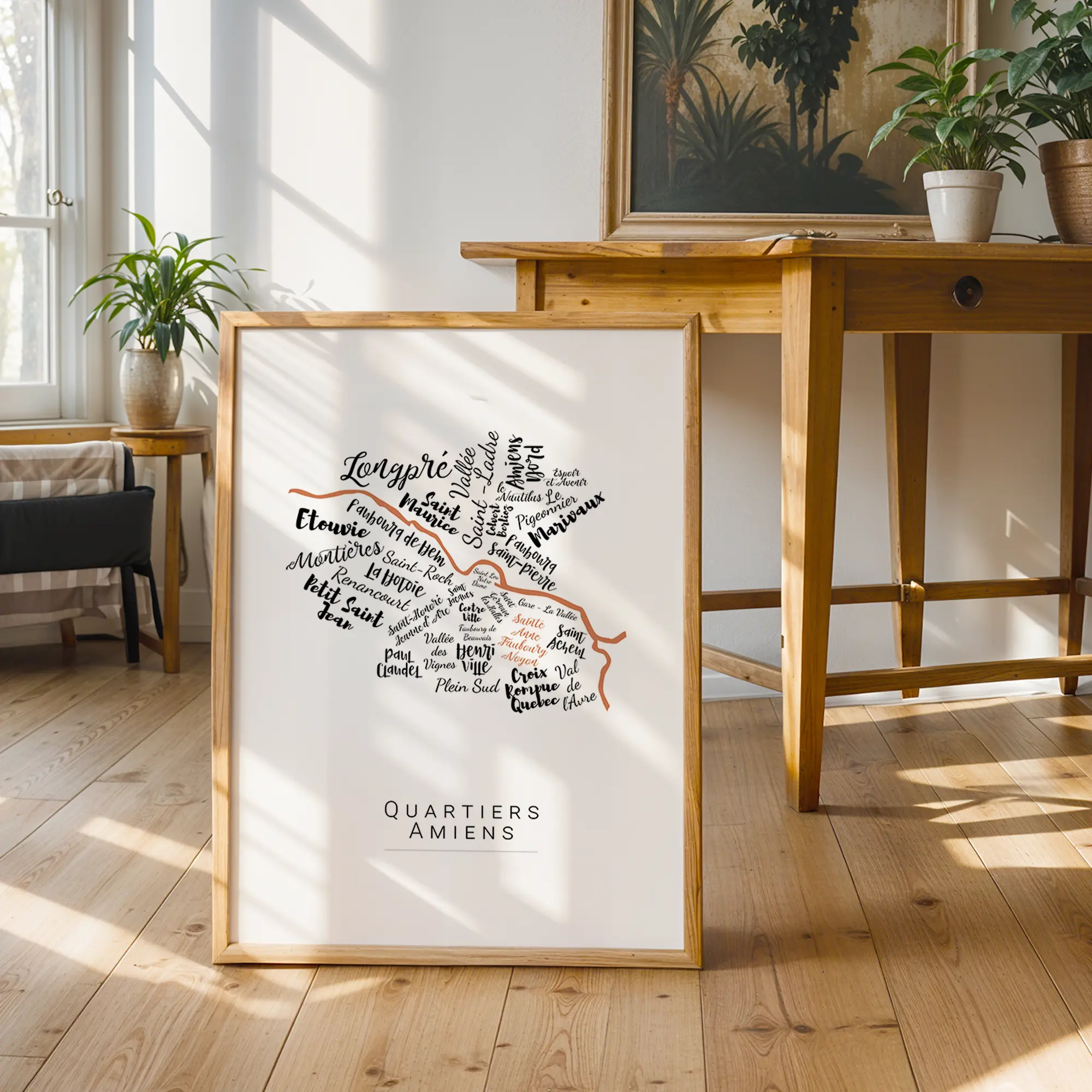 Explorez Amiens à travers une carte graphique de ses quartiers, de Saint-Leu à Henriville, en passant par Étouvie ou Saint-Acheul. Les noms calligraphiés dessinent une balade visuelle entre hortillonnages et cathédrale. Son design sobre et personnalisable s’adapte à toutes les ambiances. Une affiche chargée de sens, idéale pour garder Amiens près de soi.