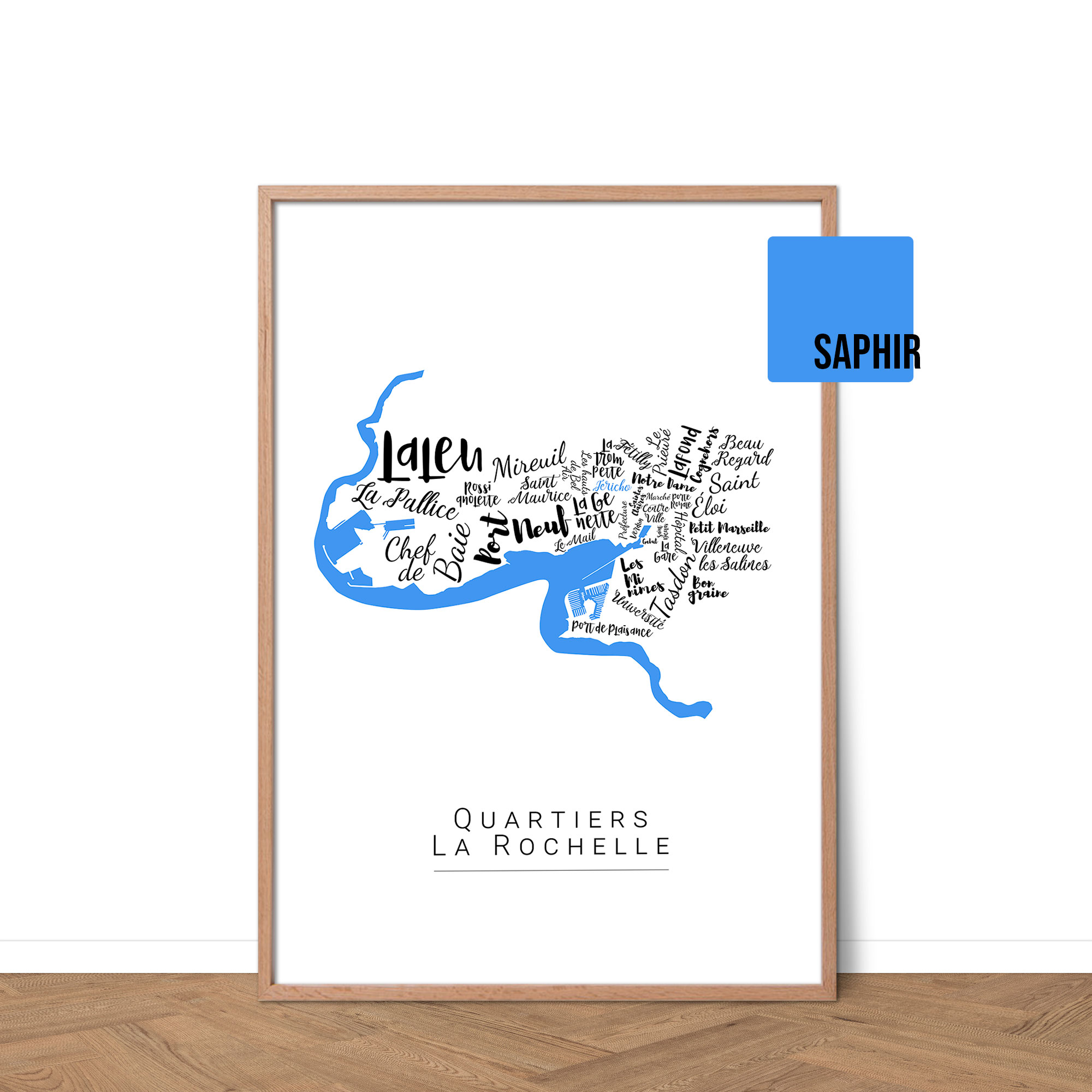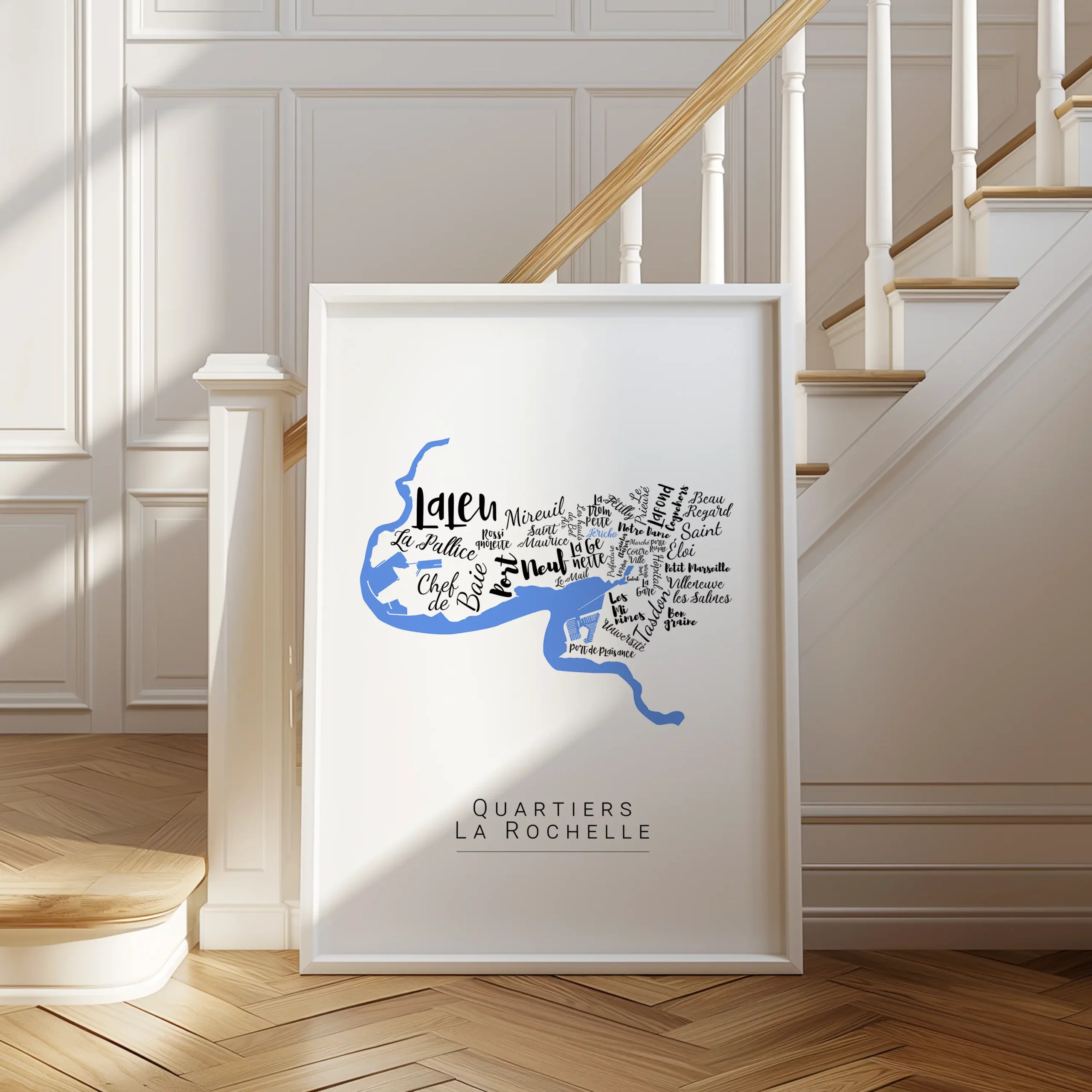 Redécouvrez La Rochelle à travers cette affiche originale de ses quartiers. Les noms calligraphiés évoquent les quartiers, les ruelles et l’air iodé. Personnalisable, elle apporte une touche marine à votre décoration. Une affiche idéale pour les amoureux de l’Atlantique.