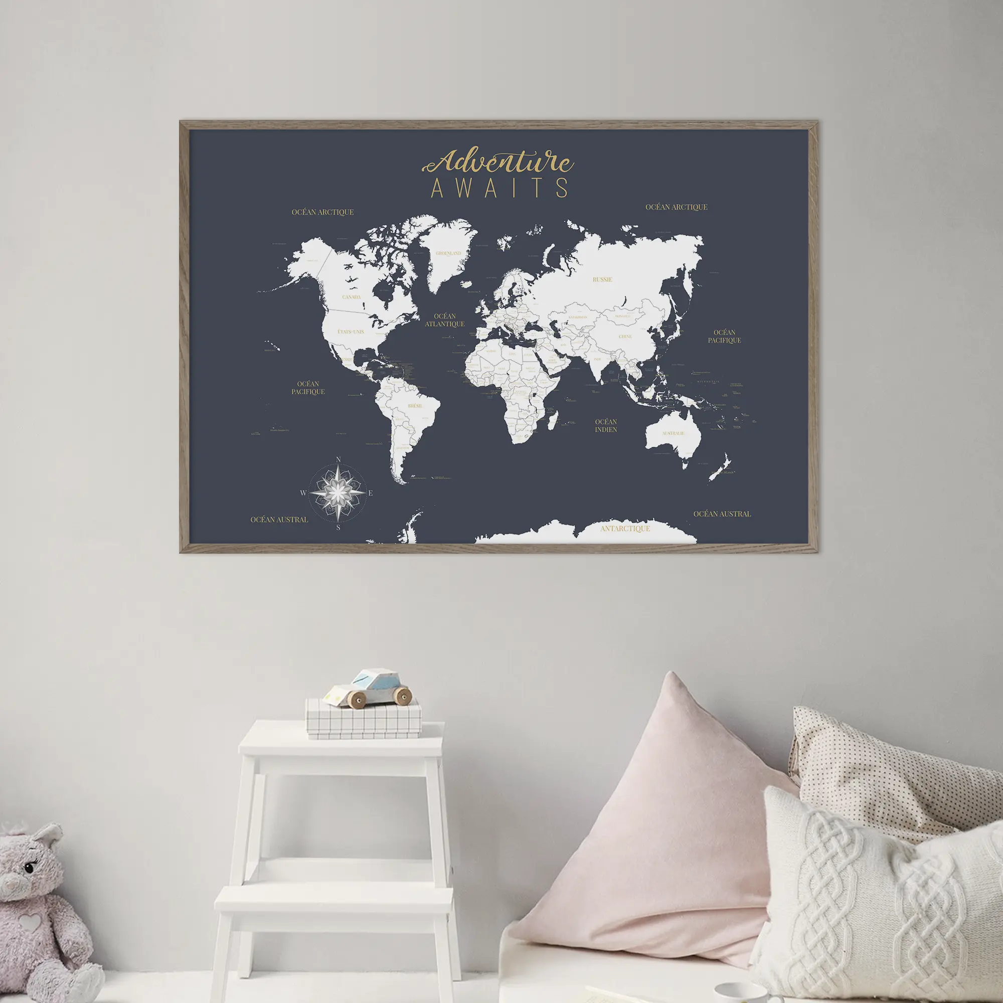 Plongez dans l’élégance intemporelle de cette carte du monde bleu marine, où la profondeur des mers se marie à la pureté des terres blanches pour créer un contraste saisissant. Véritable pièce maîtresse murale, elle affiche avec précision les pays et capitales, tout en portant une phrase inspirante : Adventure Awaits, comme une invitation à préparer vos prochaines découvertes.