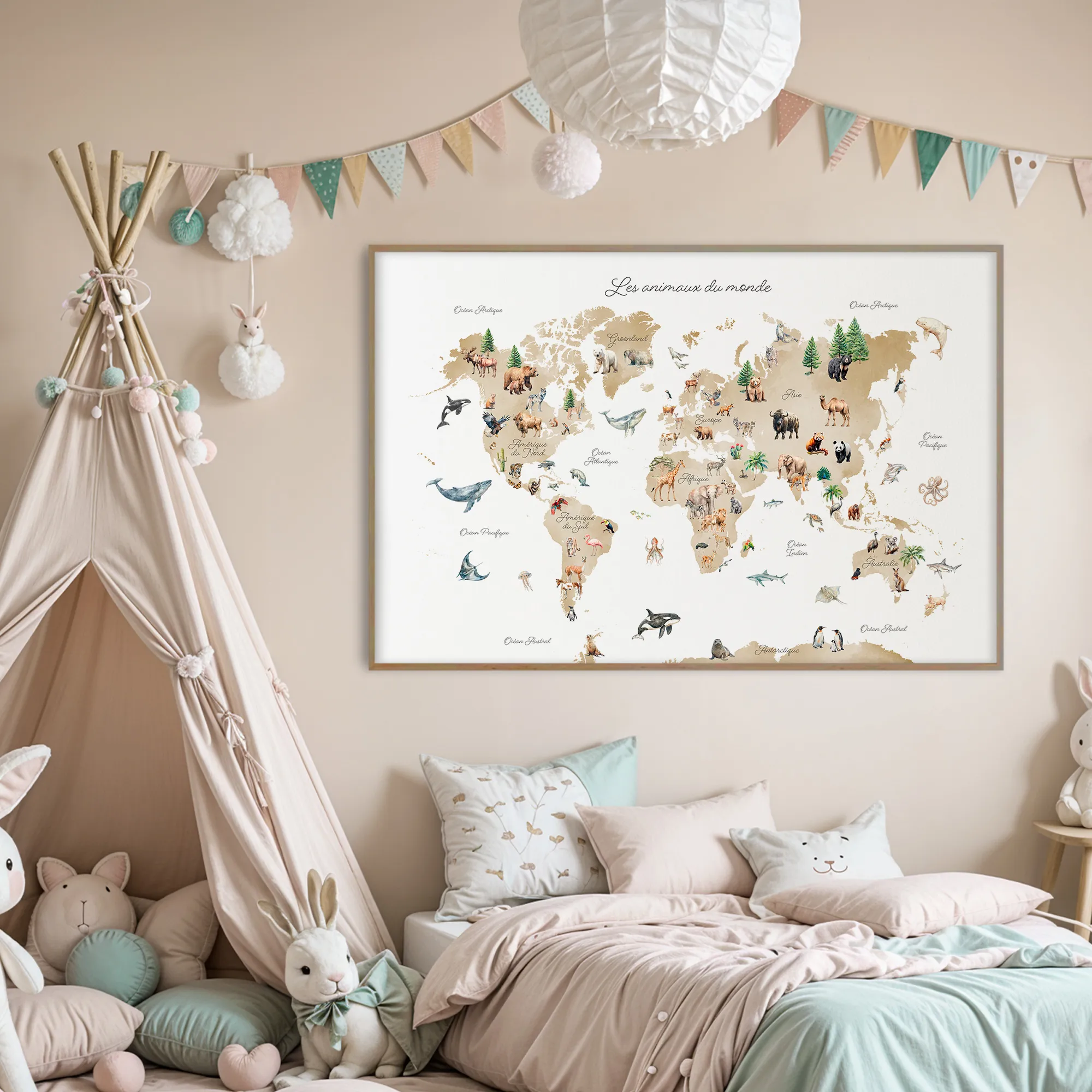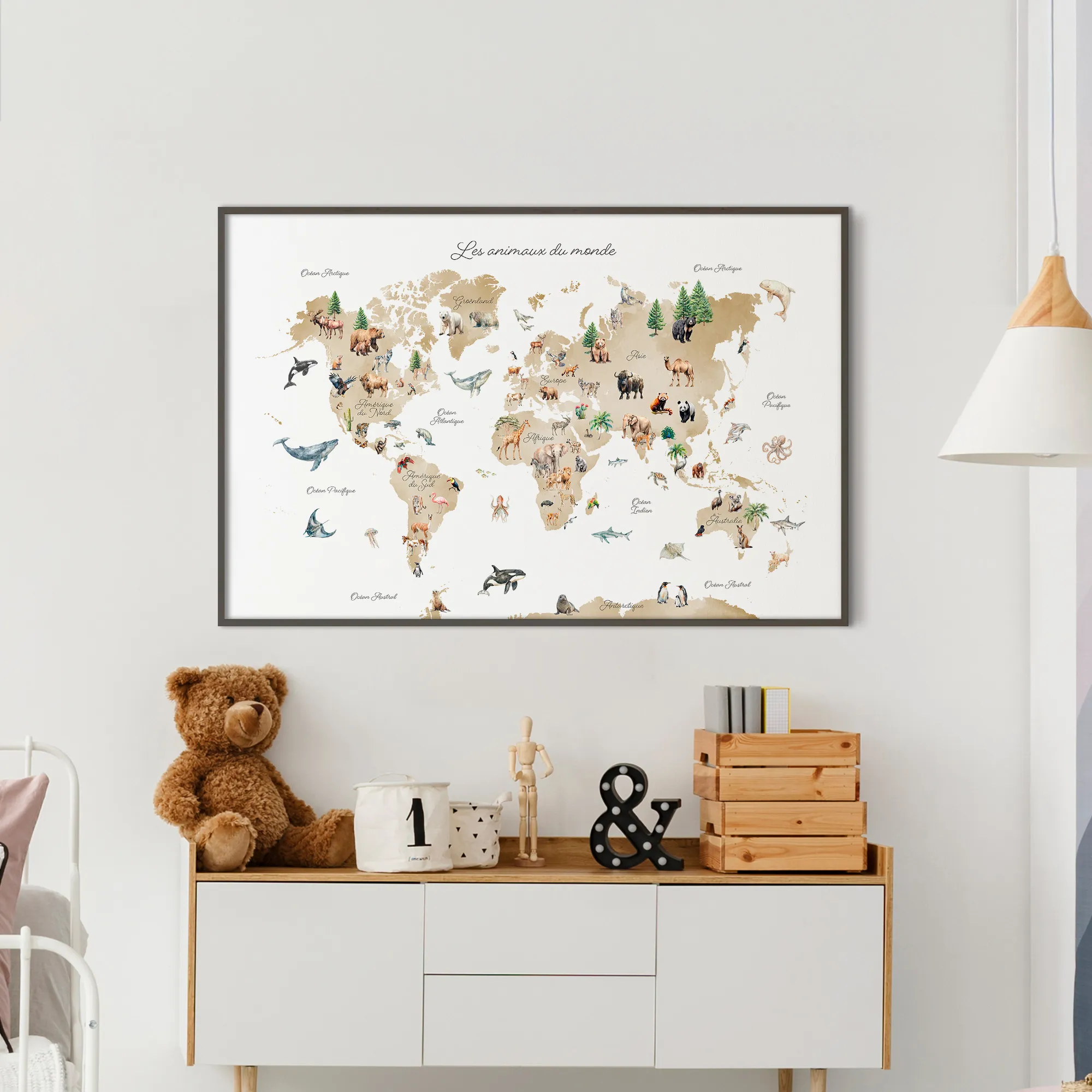 Son univers coloré et amusant stimule la curiosité, l’imaginaire et l’ouverture au monde. Parfaite pour décorer une chambre d’enfant, cette affiche est à la fois décorative et éducative, idéale pour apprendre en s’amusant et rêver aux animaux de la planète.