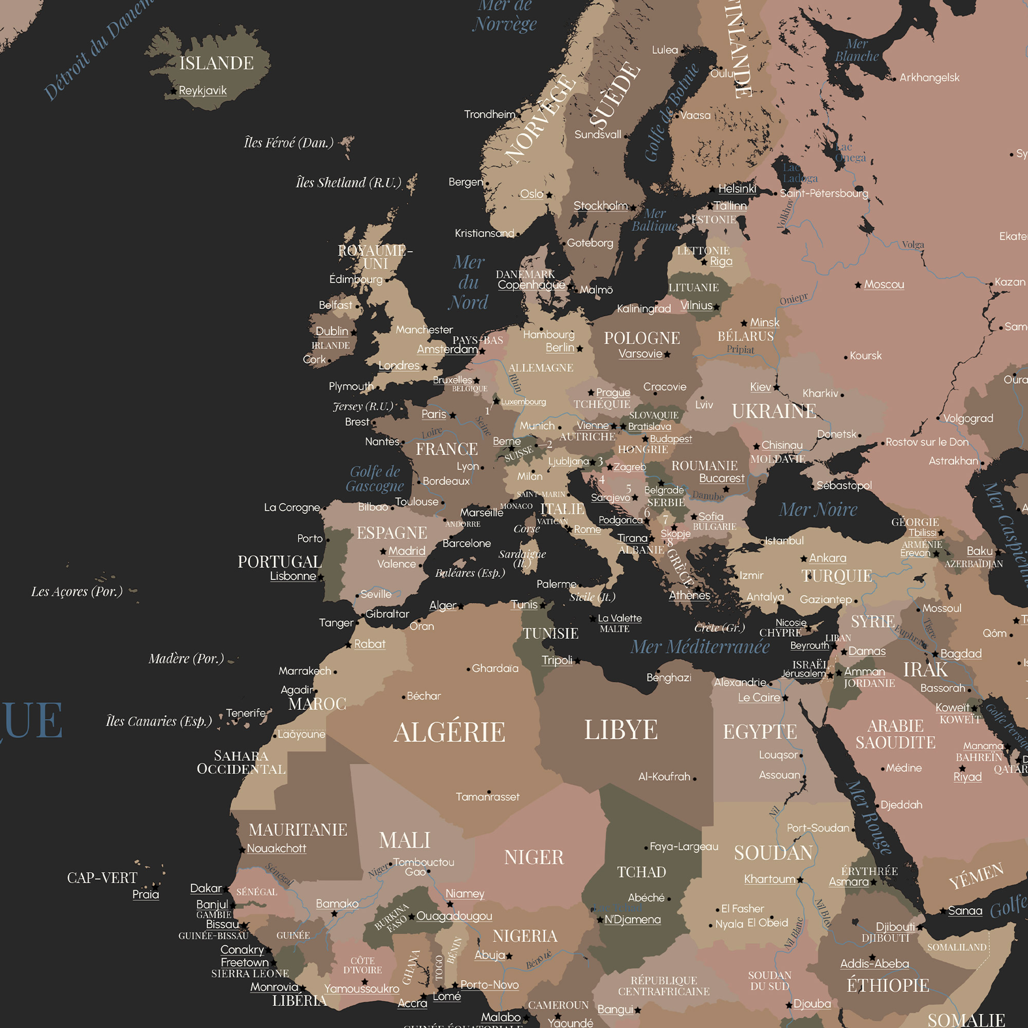 Elle affiche les pays, capitales et frontières avec une précision graphique, mais sans jamais se départir de son élégance.