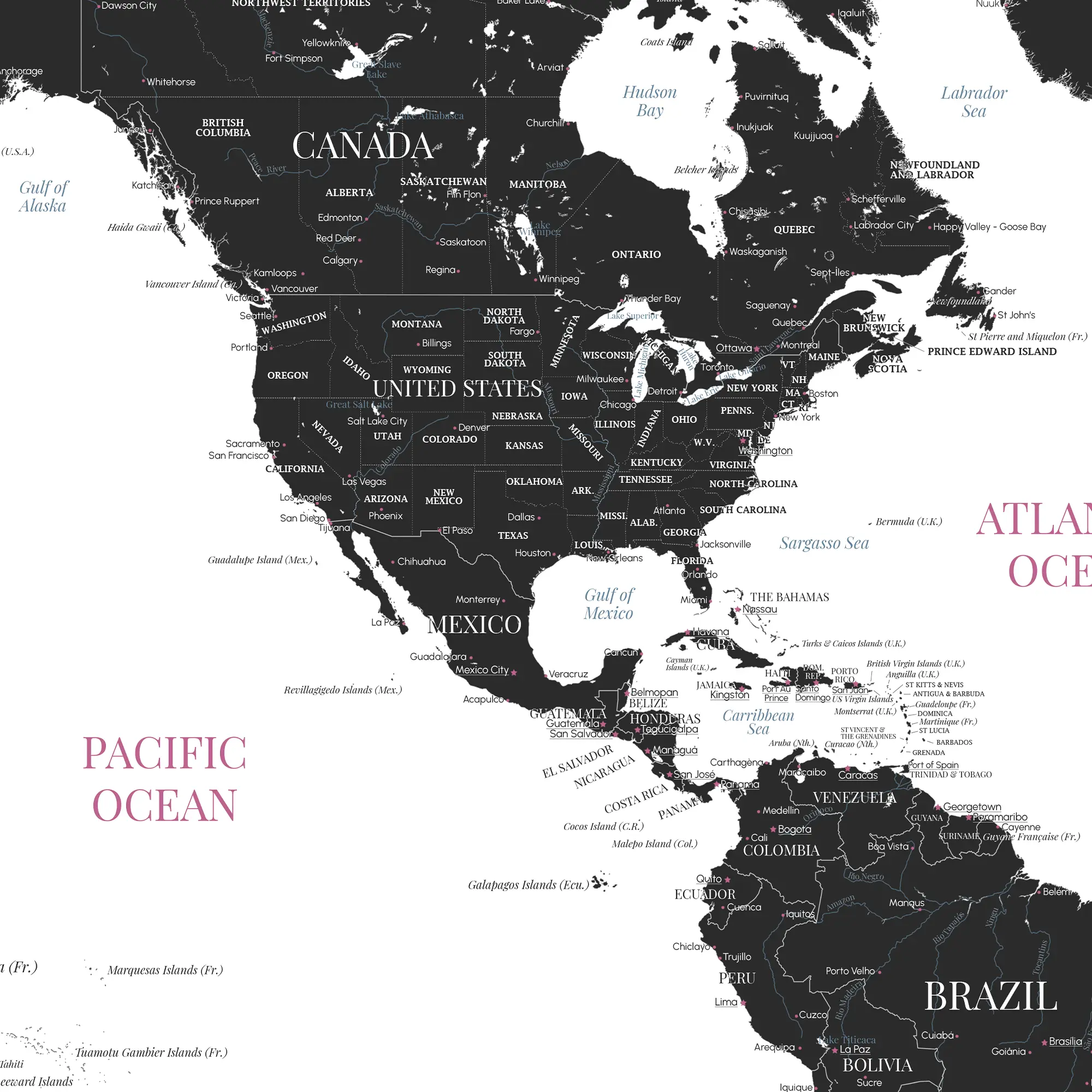 Inès est une carte du monde noir et blanc au fort contraste, parfaite pour un salon moderne ou une décoration de bureau. À la fois affiche éducative et planisphère noir et blanc, elle affiche clairement pays, capitales et frontières pour inviter à explorer la géographie à la maison.