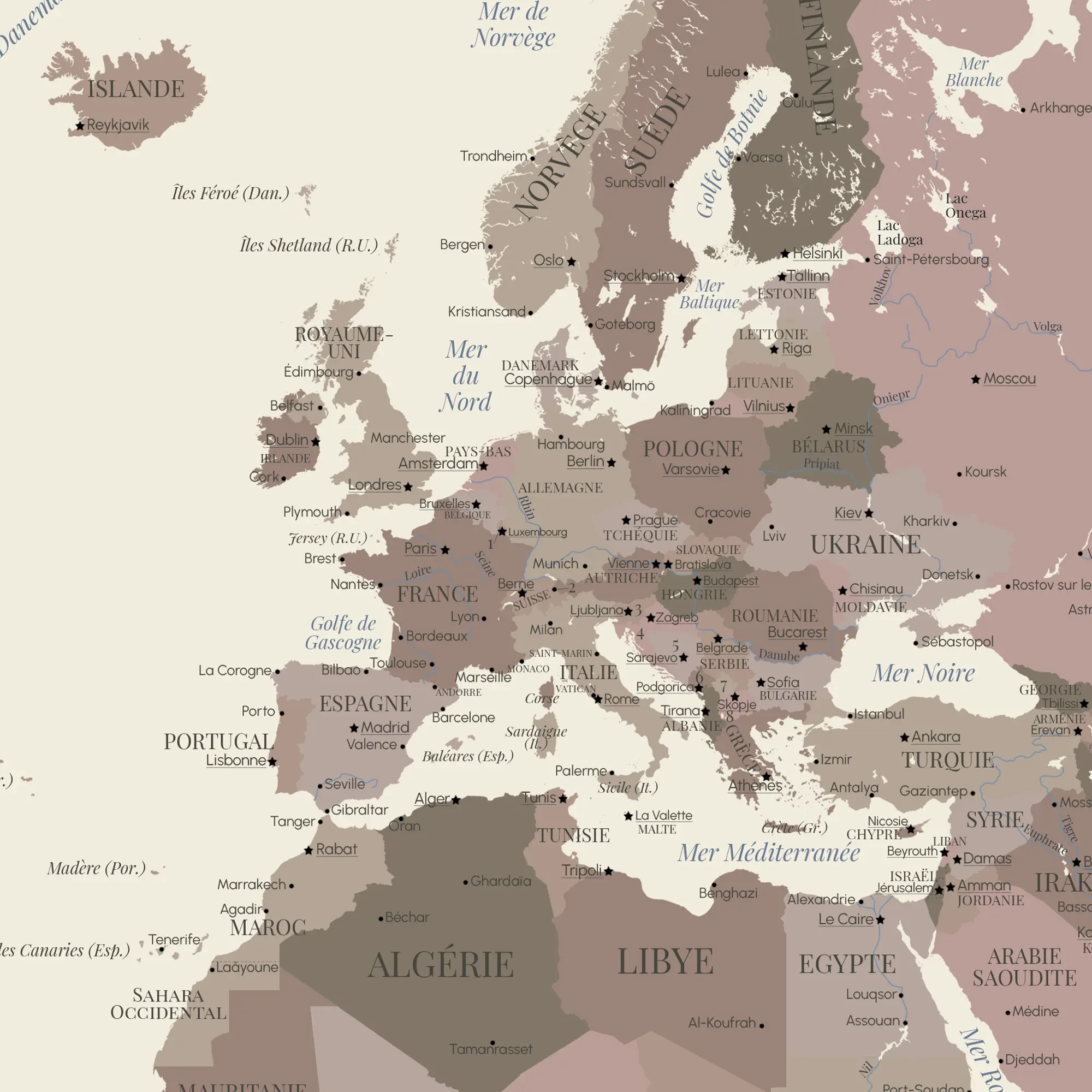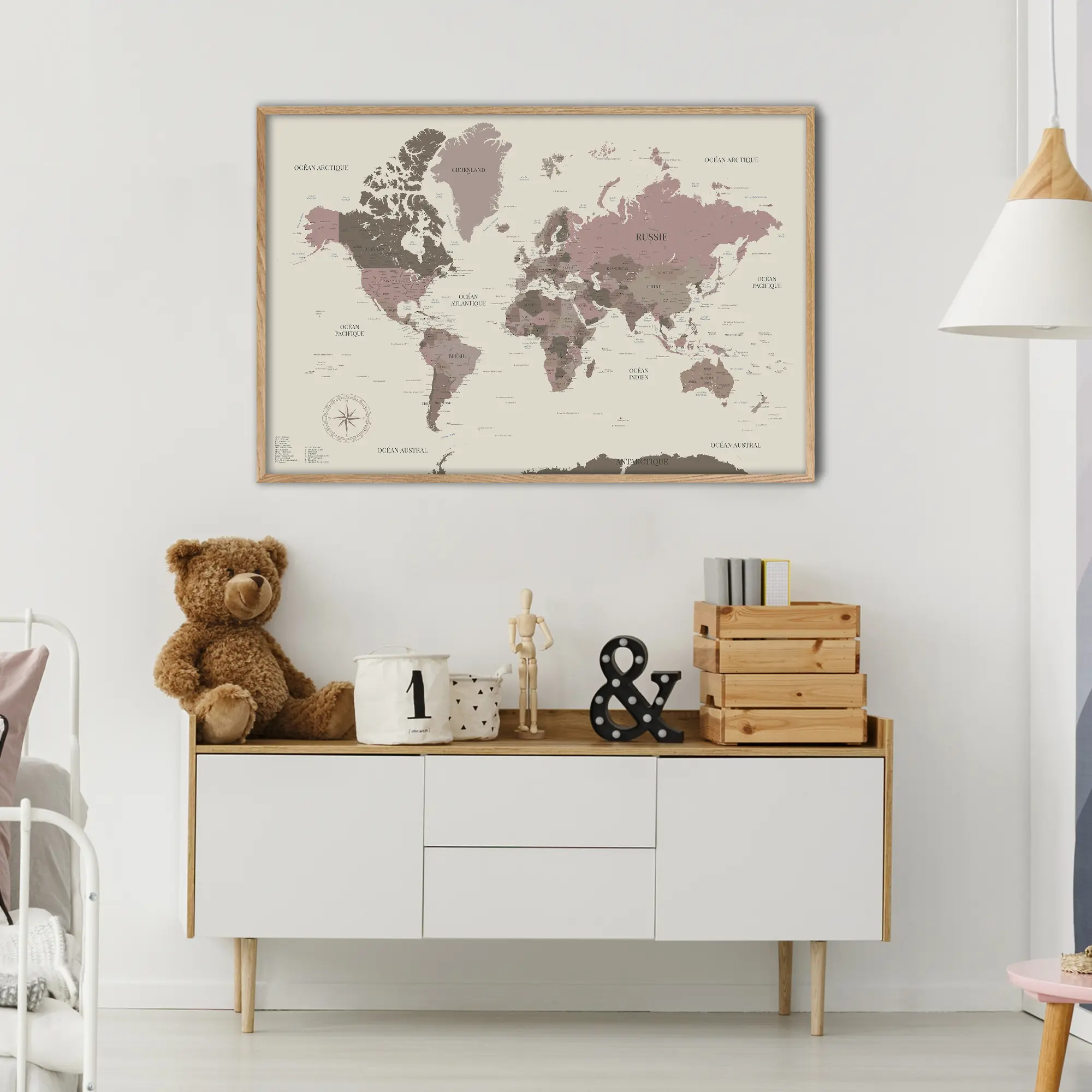 Chaque pays, capitale et frontière est finement dessiné, offrant une décoration murale éducative et élégante. Parfaite pour une chambre d’enfant ou un coin lecture, elle inspire les rêves d’aventure et la curiosité.