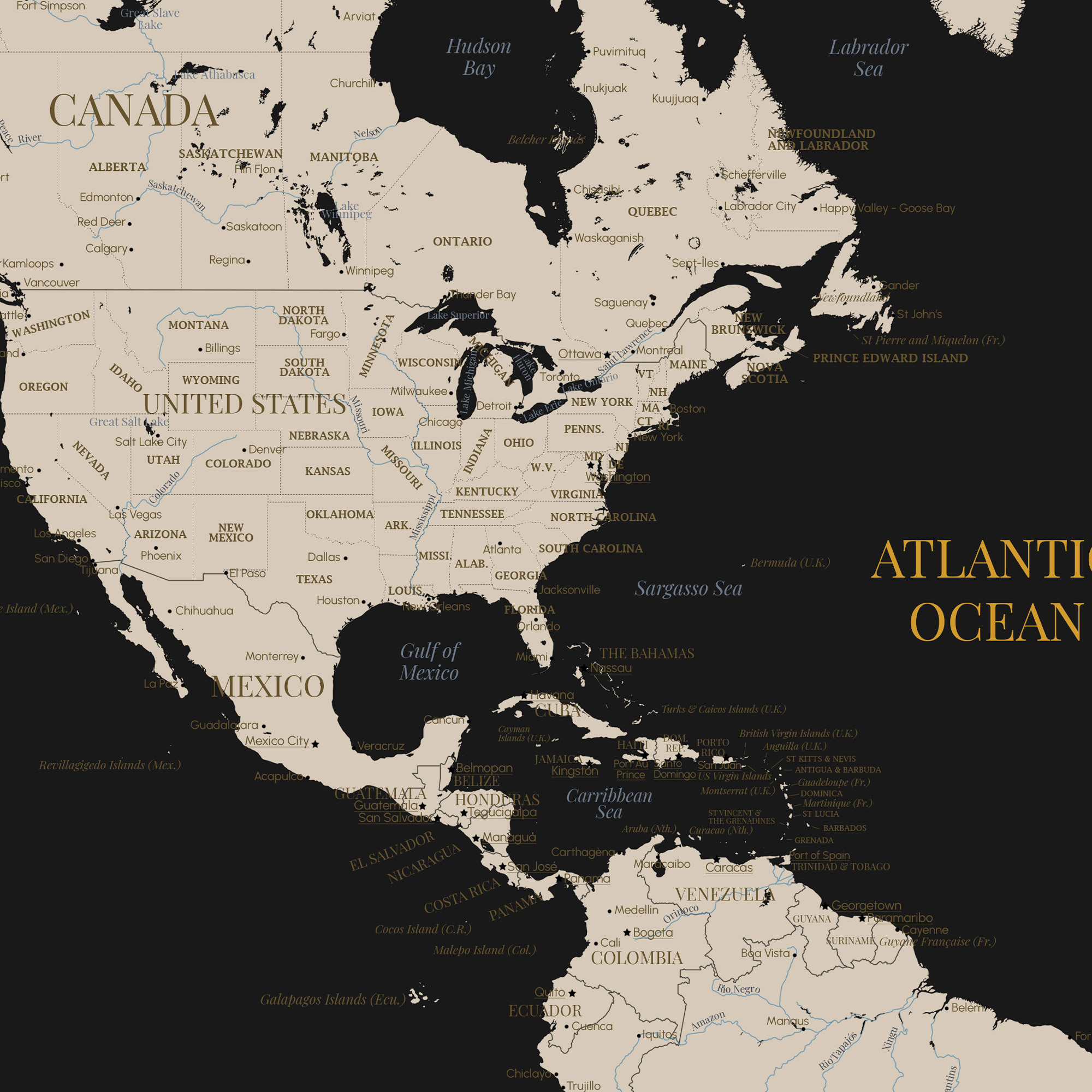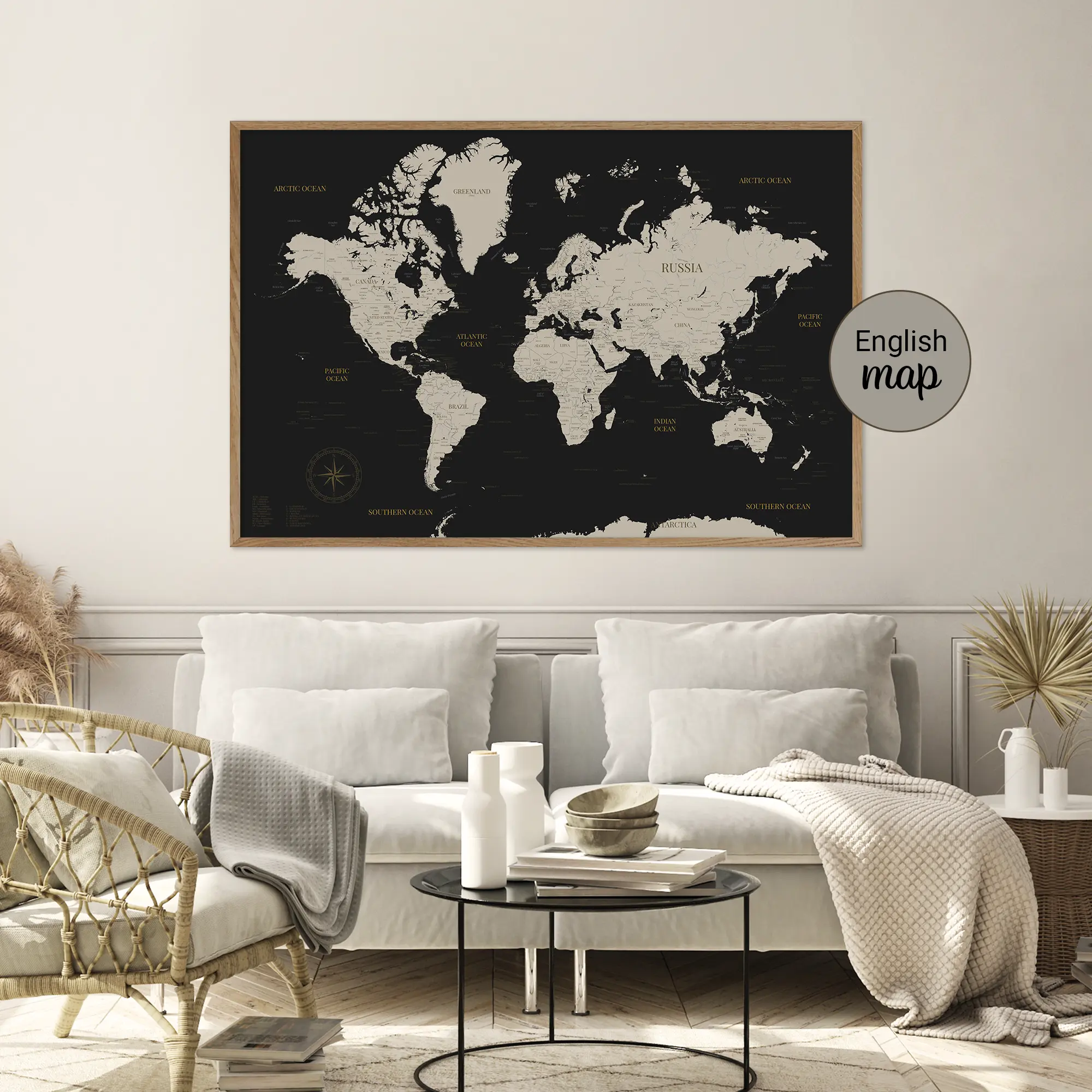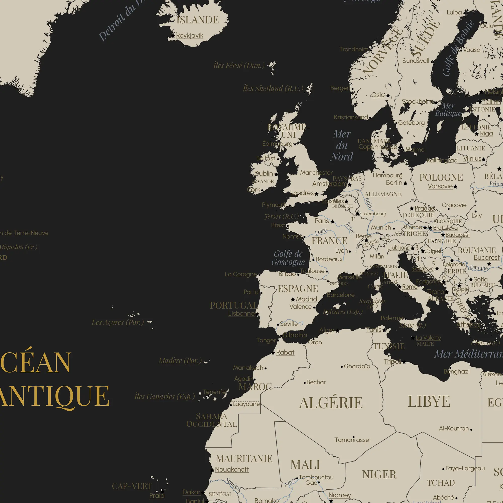Sur un fond noir feutré, Pedro déploie ses continents comme un dessin clair gravé à la craie, puissant et graphique. Cette carte du monde contrastée impose sa présence avec audace, attirant les regards et invitant à l’évasion. Elle s’invite avec caractère dans un bureau moderne, un salon industriel ou la chambre d’un ado en quête d’aventures.