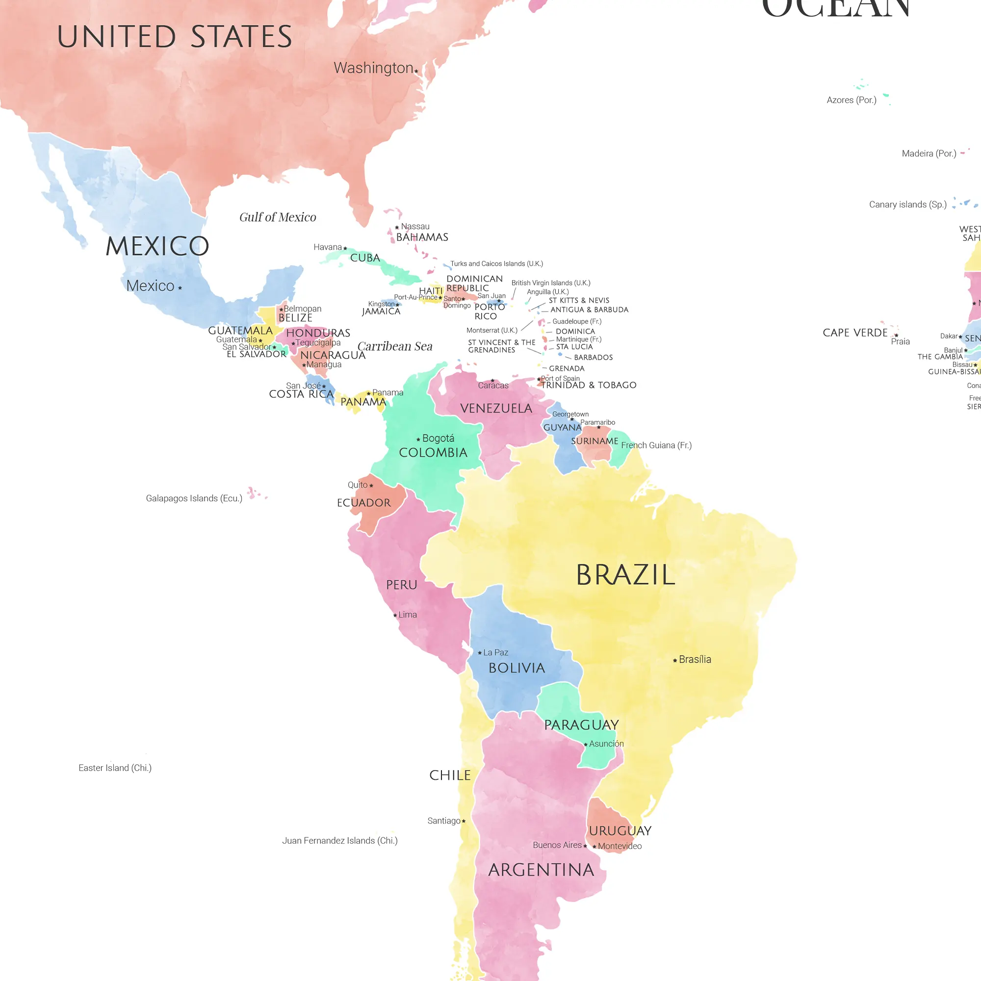 Cette carte du monde colorée design illumine les murs avec ses teintes vives et son fond blanc épuré. Véritable affiche murale éducative, elle affiche 197 pays, leurs capitales et les grandes villes, parfaite pour éveiller la curiosité des enfants.