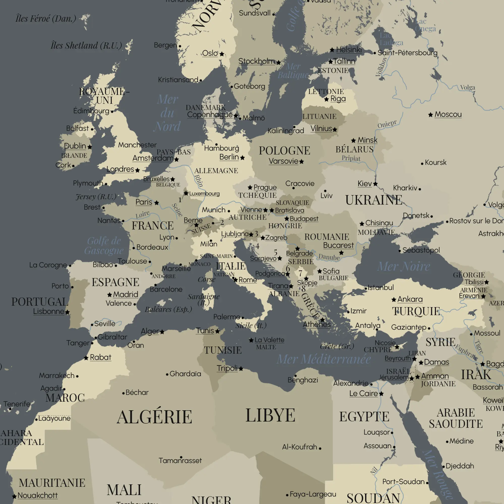 Découvrez Nick, une carte du monde bleu océan qui invite à l’évasion et à la découverte. Son grand format met en valeur les mers d’un bleu profond, contrastant avec des terres délicatement dessinées pour un rendu harmonieux et apaisant. Parfaite pour une décoration de bureau, cette affiche murale allie design et pédagogie : elle détaille les contours des continents, des pays, et offre une lecture claire et précise, idéale pour éveiller la curiosité.