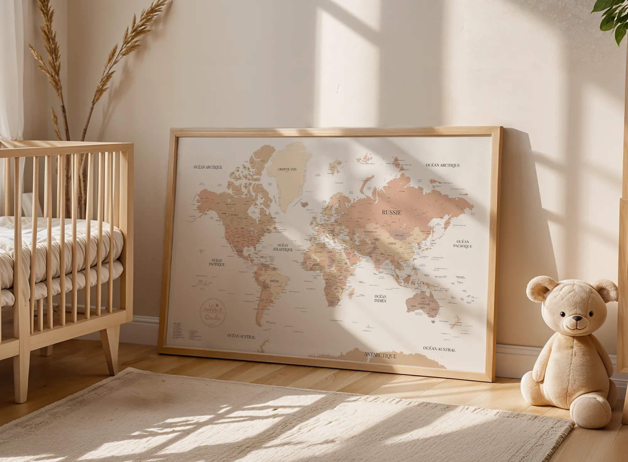 Personnalisée, elle devient bien plus qu’un poster ou qu’un planisphère mural — un objet chargé de sens : un cadeau de naissance délicat portant un prénom et une année, un hommage à une famille voyageuse affiché au cœur du salon, un souvenir d’emménagement ou de mariage, ou encore une déclaration discrète inscrite sur votre mur.